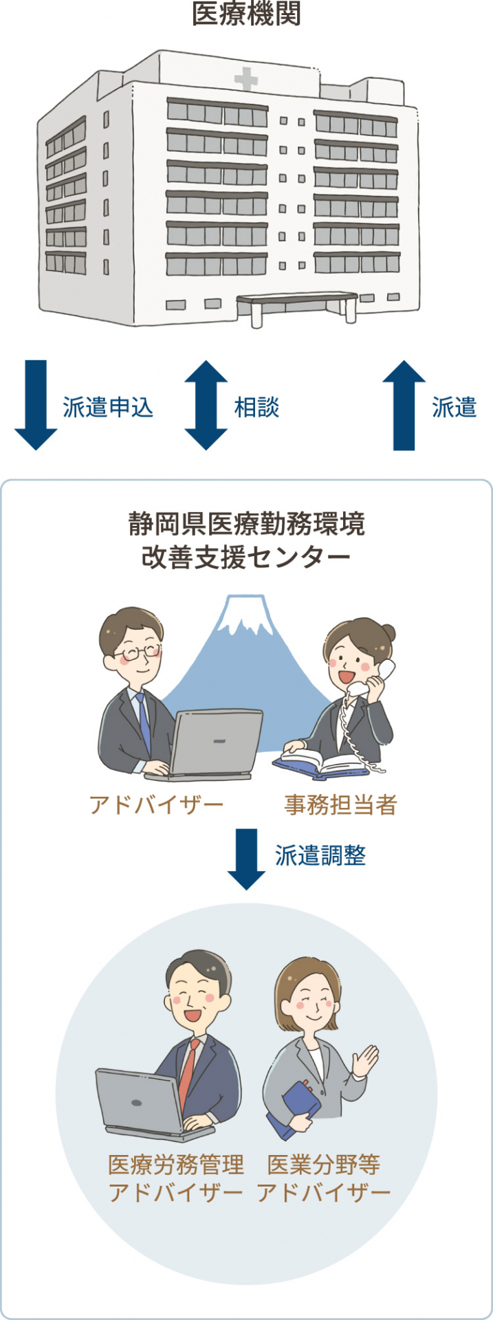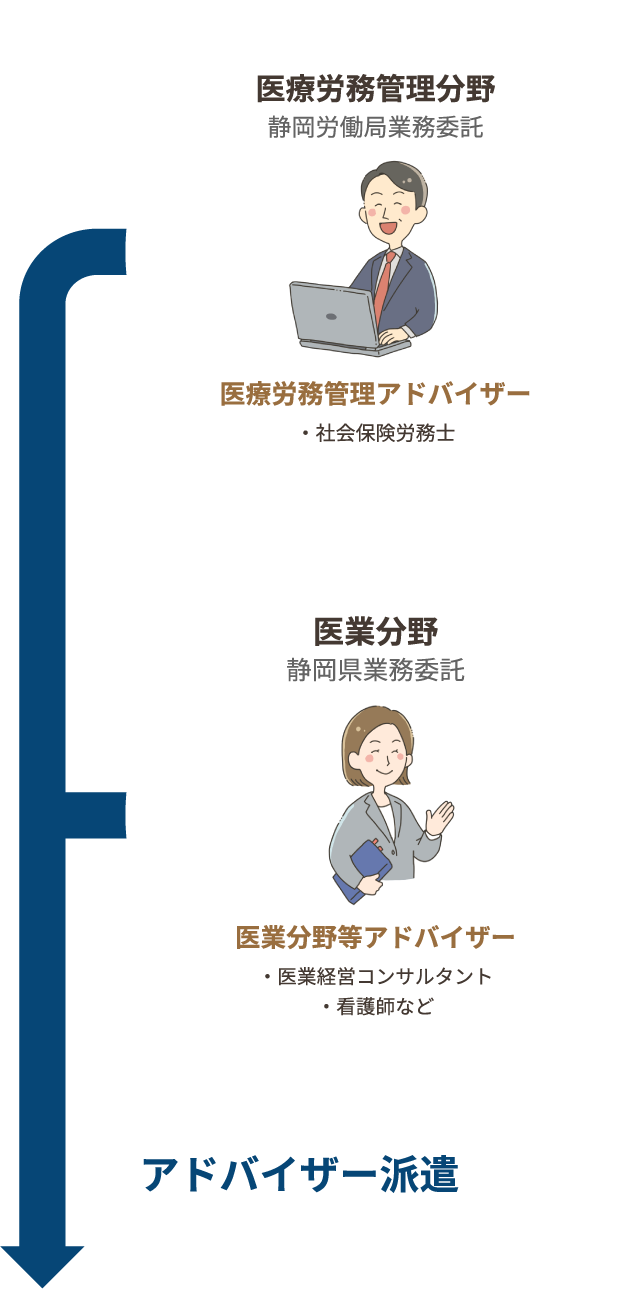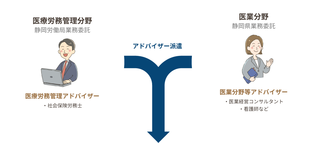 アドバイザーは、医療労務管理アドバイザー(社会保険労務士)、医業分野等アドバイザー(医業経営コンサルタント、WLB/ワークライフバランス推進委員等)の専門家です。